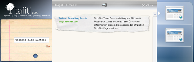 Seit 22. August ist Tafiti online. Tafiti ist eine experimentelle Suchmaschine basierend auf Live Search, welche eine Weboberfläche mit Microsoft Silverlight bietet. “Tafiti” ist Suaheli und steht für “forschen” (der Name klingt ja schon cool und neu). Die Oberfläche wird noch als Beta-Version ausgegeben, funktioniert aber bestens.