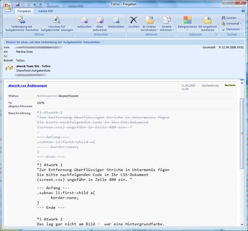 Aber genug der Schwärmerei, es gibt auch manchmal Tücken, die Active Sync verhindern, von einer solchen möchte ich heute berichten: Vor einiger Zeit haben wir einen Microsoft Office Sharepoint Portal Server 2007 (MOSS) in Betrieb genommen. Wir verwalten in diesem unter anderem eine ToDo List, wo jedes Team-Mitglied seine Aufgaben einträgt (oder wo diese eingetragen werden).