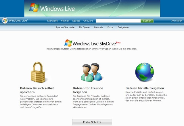 Auf Windows Live gibt´s nun mit Skydrive.live.com einen gratis Online-Speicherplatz zum Sichern und Austauschen von Dateien. Die Kapazität ist mit 1GB beschränkt und es ist steuerbar, ob der Space nur für sich selbst, Freunde oder für alle User verfügbar sind. Es ist nur eine Anmeldung mit Live-ID erforderlich.