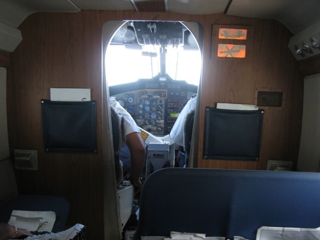 Nach dem unser gebuchter Flug umgebucht wurde, und wir dann irgendwann mal ausgerufen wurden, hat man uns einen kleinen Flieger am Flugfeld gezeigt, in den wir einsteigen sollen. Der Flieger entpuppt sich als zweimotorige Twin Otter mit dem Charme eines alten VW Käfers.
