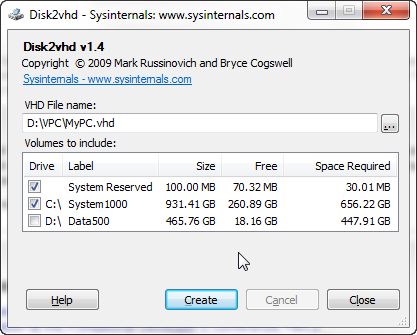 Das freie Tool Disk2vhd der System-Gurus Mark Russinovich und Bryce Cogswell aus den Windows Sysinternal liegt seit 1. Dezember in Version 1.4 vor (Details siehe auch hier im Blog Wie konvertiere ich einen physischen PC in einen virtuellen PC?).