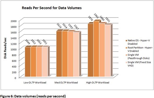 Disk-Latenz-Zeiten: VHD hat die größte Latenz; zw. native und pass-through disk gibt es keinen Unterschied “…however, we noticed no difference between these and the values reported by the root partition.”