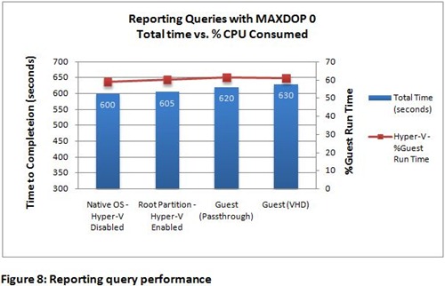 Schon interessanter: Wie schnell werden Abfragen ausgeführt? Die Queries waren in der VM minimal langsamer. “The difference between running the queries in guest virtual machines and running them natively or on the root partition was minimal; we observed a relatively small performance overhead increase with the guest virtual machines.”