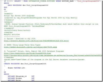 Ab SQL Server 2005 werden Diagramme in [sysdiagrams] gespeichert. Diese Eigenschaft machen sich zwei kleine Stored Procedures zu nutze und können so ein bestimmtes Diagramm auslesen und scripten.