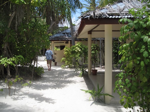 Das Empfangskomitee auf Vilamendhoo bestehend aus einem Security-Mann als Gepäckannahme, einem Kellner und einer Reisebetreuerin schenkte uns eine Blume und führte uns zur Rezeption zum Formular ausfüllen. Nachdem auch der grauenhafte Kokusnuss-Drink gekostet und das Formular ausgefüllt war, durften wir Mittagessen gehen; aber nur jene, die „All Inclusive" (AI) gebucht hatten. Die anderen (Halbmenschen, da Halbpension) durften wahrscheinlich auf die Zimmeraufteilung warten.