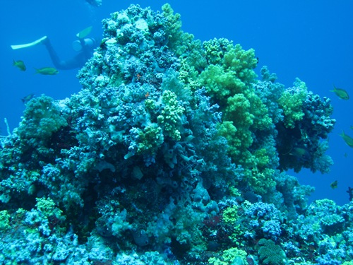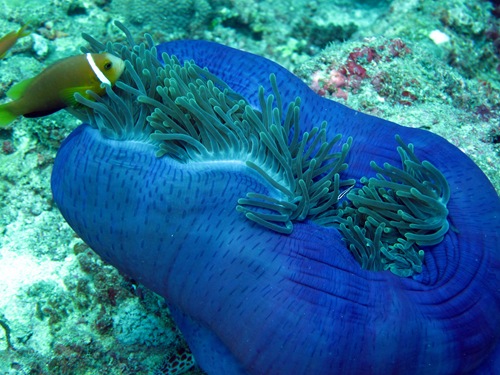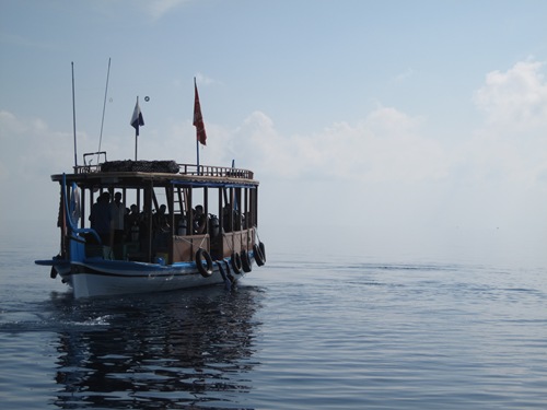 Am Ende des Tauchgangs lässt man sich beim Auftauchen von der Strömung ins Blaue treiben und jedes Buddy-Team setzt beim Sicherheitsstop eine Boje – ja das haben wir wirklich rasch gelernt mit dem Bleistück unten dran – und das Dhoni sammelt die Taucher ein. Das Blaue hat schon etwas Geheimnisvolles an sich. Anfangs glaubt man noch, dass jetzt „etwas Großes" vorbeischwimmen könnte, in Wahrheit ist es aber einfach nur leeres Blau. Wahrscheinlich würde ich mich auch ziemlich erschrecken, wenn jetzt eine Delfin-Herde, Pilot-Wale oder ein Walhai vorbeizieht…