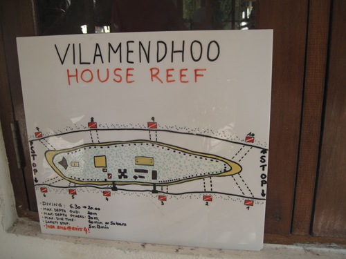 Das Tauchen findet jeweils einmal am Vormittag und einmal am Nachmittag vom Dhoni (Holzboot) aus statt, außer man geht selbst am Hausriff tauchen. Am Hausriff kann man auf der Nord und auf der Südseite tauchen, je nach Strömung. Auf Vilamendhoo existieren 10 „Eingänge" die mit Bojen markiert sind, die letzten Eingänge sind sogar mit zwei Bojen markiert, damit man nicht mit der Strömung ins Blaue hinausschießt. Es sind auch tatsächlich recht viele Schnorchler unterwegs. So kann man das große Aquarium auch nutzen.