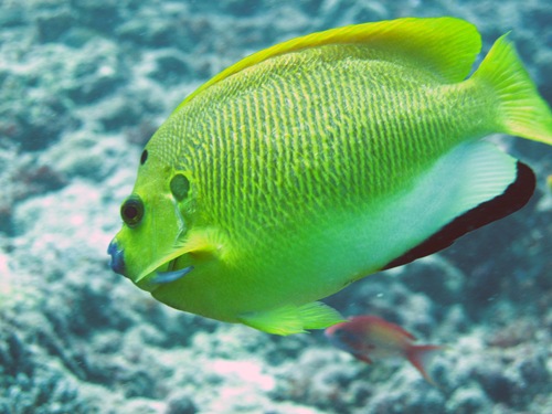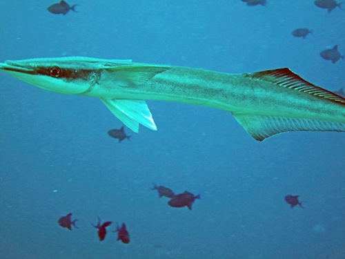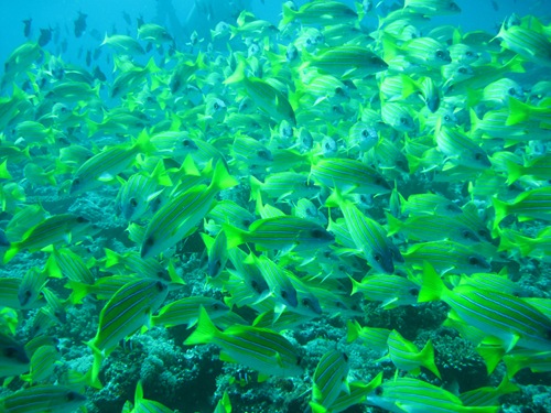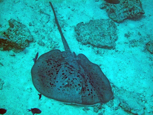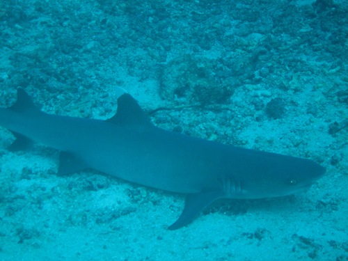 Was man bei einem Tauchgang fast immer sieht, sind Weißspitzen-Riffhaie (Mike´s Beschreibung: Würschtel mit Flossen), Muränen, Fischsuppe (wirklich viele Fischschwärme, Barsche, Gelbflossenmakrelen, kleine blaue Drückerfische und so weiter). Manchmal Adlerrochen, Schildkröten, Barracudas, Schiffshalter und bei besonders viel Glück Mantas.