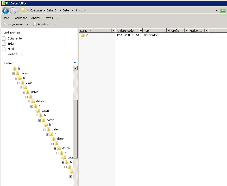 Also, Das Verzeichnis am Server lautet D:\Daten\H. Und hier drin die ewige Verzeichnisstruktur. Damit ich versehentlich nichts kaputt mache – da sind ja noch mehr Daten drauf! - benenne ich das zu löschende Verzeichnis um: Aus D:\Daten\H\Daten wird gleich mal D:\Daten\H\x und da drin das erste Verzeichnis x1 – so fühle ich mich irgendwie “sicherer”.