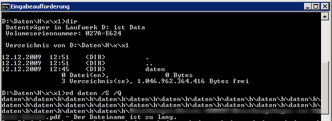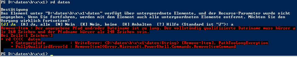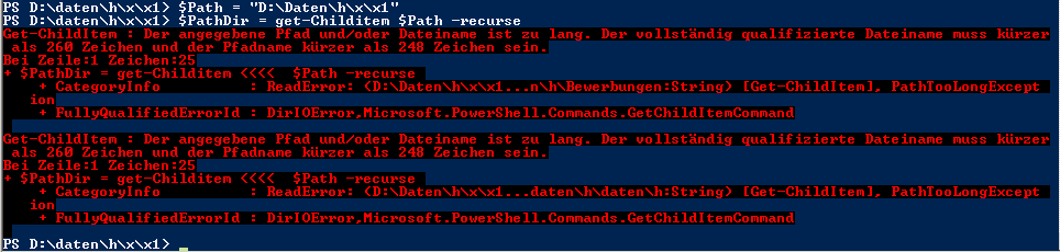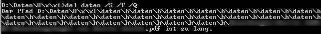 Oder Umbenennen aller Verzeichnisse in den kürzest möglichen Pfad, z.B. “1” – aber automatisiert, denn sonst sitze ich morgen noch da: D:\Daten\H\x\x1\1\1\1\1\1\1\1\1\1\1\1\1 …