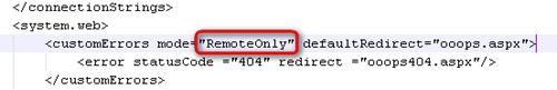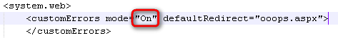 Ausbessern von customErrors in mode=”On” – wichtig ist auch, eine eigene defaultRedirect-Webseite (die natürlich im Web vorhanden sein muss) anzugeben, hier ooops.aspx.