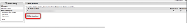 BIS wird im Blackberry Online Portal eingerichtet. Zunächst wählen Sie über E-Mail einrichten aus, dass ein Konto hinzugefügt wird.
