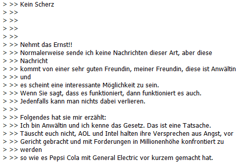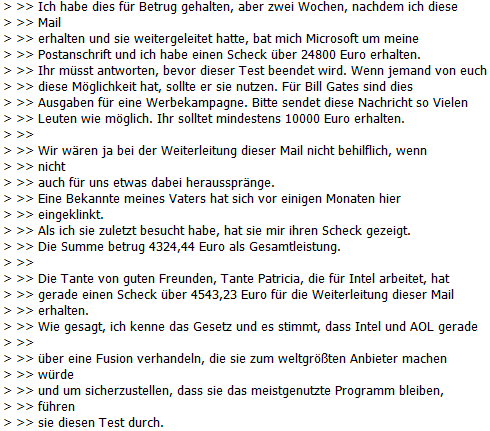 Gerade ist folgende E-Mail in meiner Mailbox gelandet: Bill Gates verteilt gerade sein Vermögen – bitte leitet diese E-Mail an soviel Leute wie möglich weiter. Kein Scherz – natürlich nicht….