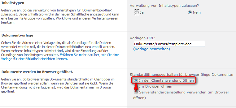 Das Standard-Verhalten zum Öffnen eines Dokuments von “(x) Serverstandardeinstellung verwenden (im Browser öffnen)” ändern auf “(x) In der Clientanwendung öffnen”.