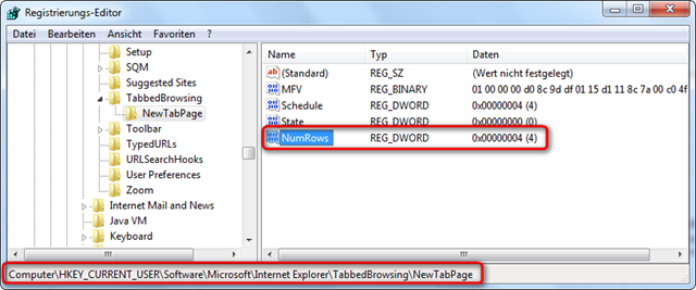 einen neuen Key vom Type DWORD mit Namen “NumRows” und dem Wert “4” (Hex oder Dez.) - wie hier:
