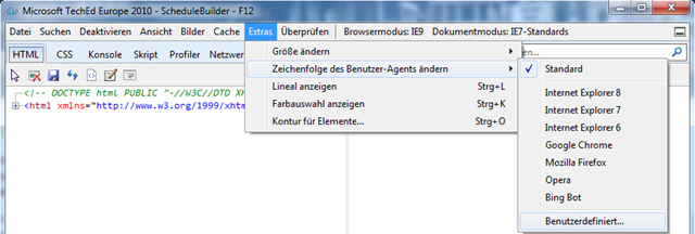 Im Menü “Extras/Zeichenfolge des Benutzer-Agents ändern” (Change user agent string) kann das Rendering auf andere Browser umgeschalten werden, z.B. auf einen “Benutzerdefinierten” Typ mit Einstellungen fürsMobile Phones od. ähnliche Browserkennungen – Cool für Web Developer!