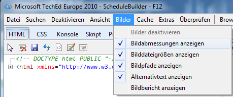 Sehr hilfreich finde ich auch die Bild-Informationen. In Developer Tools, Menü “Bilder/Bildabmessungen … anzeigen” aktivieren – zeigt die Größe aller Bilder in der Webseite, auch die Alt-Tag-Info, Bildpfad und Bildgröße: