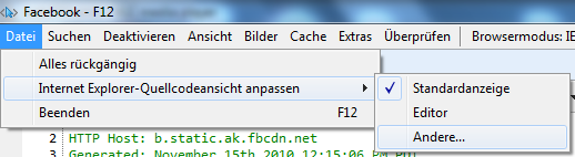 Im Developer Menu File kann auch ein alternativer Texteditor, wie z.B. Visual Studio, eingestellt werden um den Seitenquelltext darzustellen: