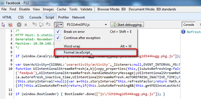 Hm. Der Javascript-Code ist für optimale Ladezeiten optimiert. Gut fürs Web – aber für einen Entwickler kaum lesbar. Dafür gibt es in den Tools die Funktion “Format Javascript”: