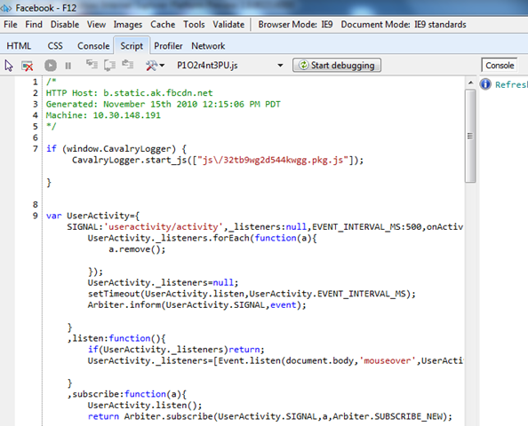 Man nehme eine Website wie z.B. Facebook . Ich will mir den Seitenquellcode ansehen – also F12. Hier nun auf Skript: Alle in der aktuellen Seite eingebetteten Javascripts werden in einer eigenen Dropdown angezeigt.