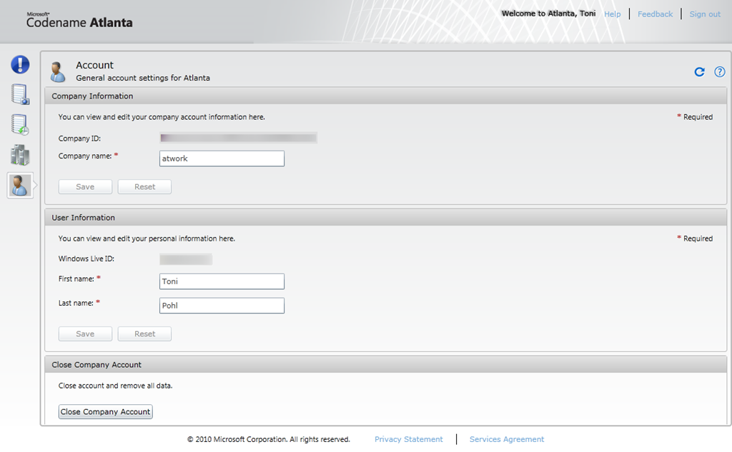 Microsoft Atlanta ist mit der konfigurierten Live-ID via https://beta.microsoftatlanta.com/ aufrufbar und präsentiert sich nach der Anmeldung so:
