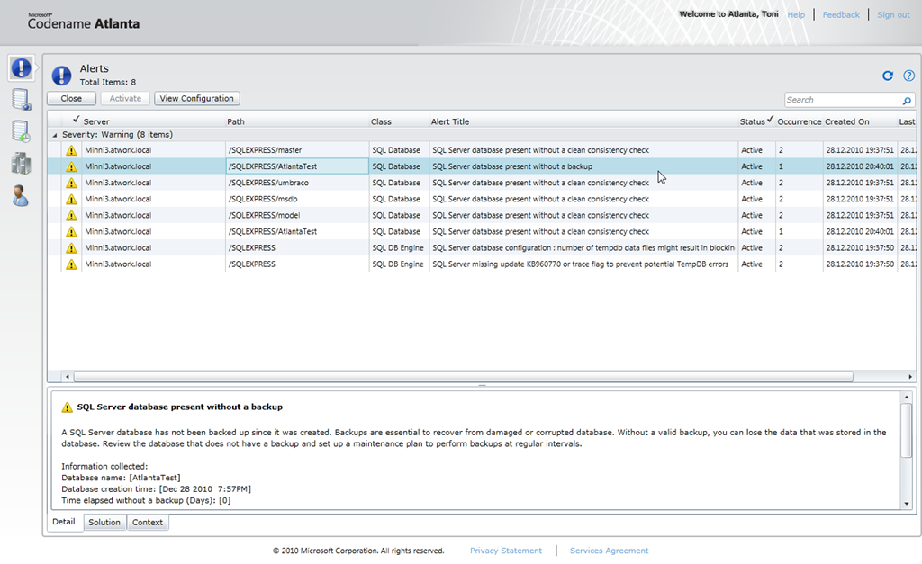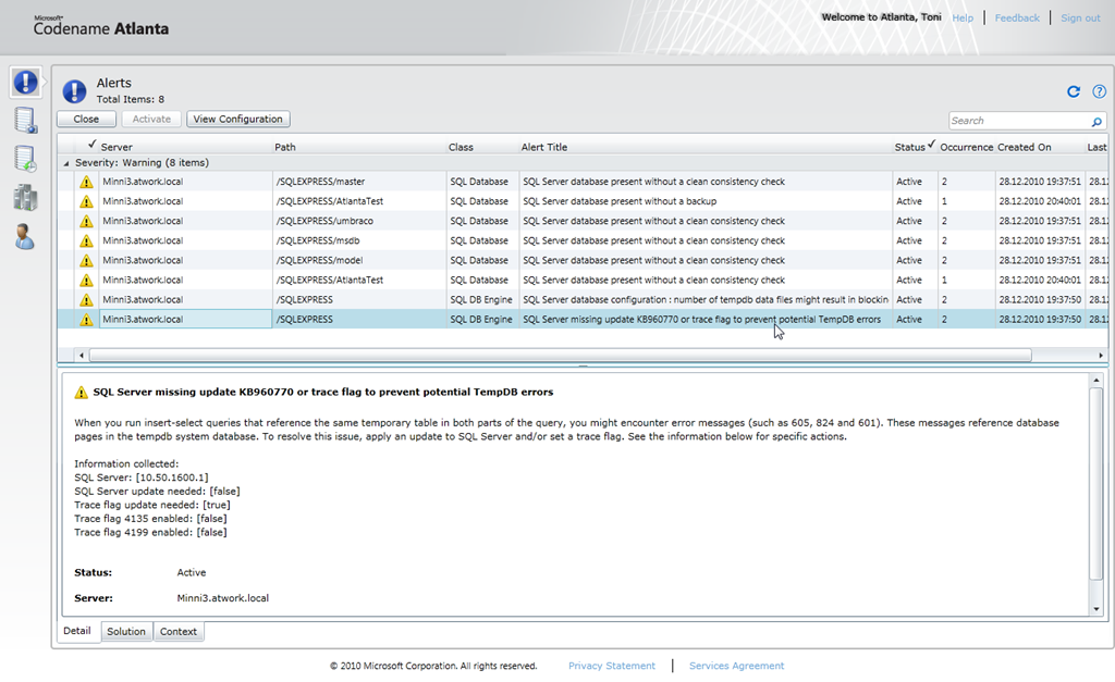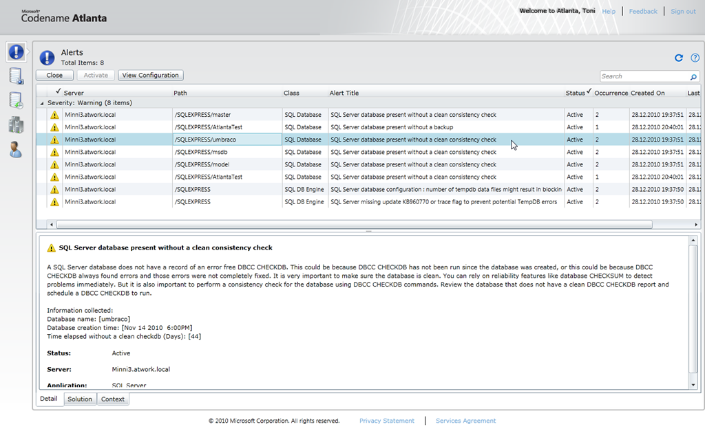Neben der Konfiguration zeigt Microsoft Atlanta den Mehrwert in den Alerts. Hier werden Warnungen und Empfehlungen mit Details angezeigt: Zum Beispiel KB-Updates oder anstehende Datenbank-Wartungen wie fehlende Backups, Konsistenzchecks und Ähnliches.