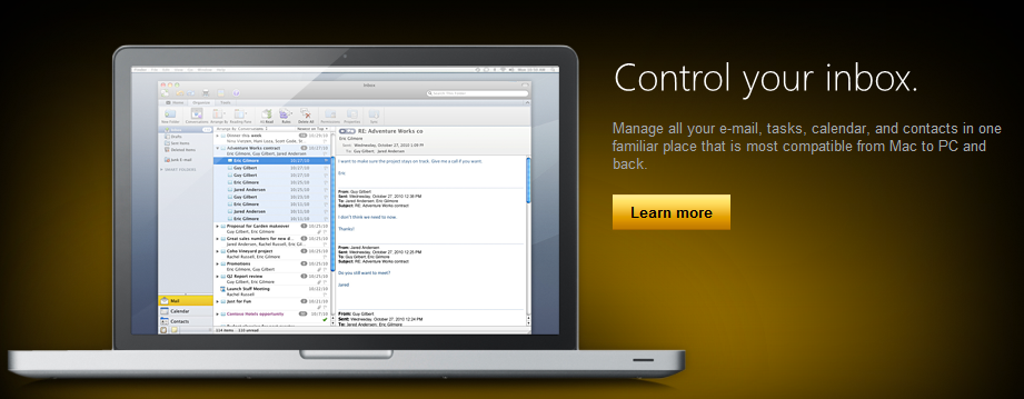 Office 2011 beinhaltet Word, PowerPoint, Excel, Messenger und eben auch Outlook. Und wo Office ist, darf natürlich die Cloud nicht fehlen: Office 2011 bietet Integration für Skydrive, SharePoint und Office Web Apps an – mit den ganzen geschätzten Features wie z.B. gemeinsames Arbeiten an einem Dokument.