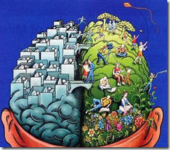 Links ist die Logik, die Analyitc, Wissenschaft, Mathematik und die Sprache. Rechts finden sich Intuition, Kreativität, Ganzheitliches Denken, Kunst und Musik.