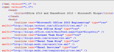 Erika Ehrli hat in Ihrem Blog eine OPML-Datei zur Verfügung gestellt, mit deren Hilfe man sich die englischen Microsoft Blogs zum Thema Office 2010 und SharePoint 2010 auf einen Satz abonnieren kann. Das OPML-File kann einfach in Outlook 2007 oder Outlook 2010 (oder in den Feedreader Ihres Vertrauens) importiert werden.