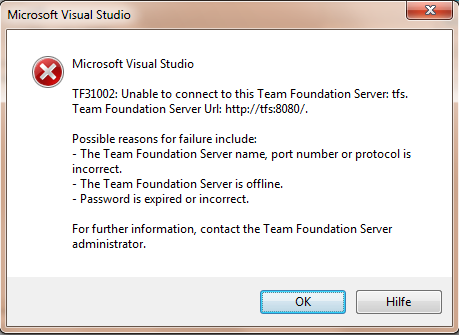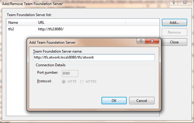 Hint: Die Idee, den Path “8080/tfs/atwork” einfach in das “Port”-Feld hinten anzufügen um die richtige URL zusammenzustellen klappt auch nicht, es folgt dieselbe Fehlermeldung – auch mit der korrekt zusammengesetzten URL. So gehts also auch nicht. What next?