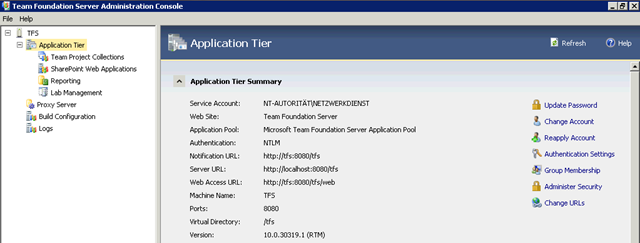 Also mal rasch die Einstellungen in der neuen TFS 2010 Administration Console einsteigen und URLs prüfen: