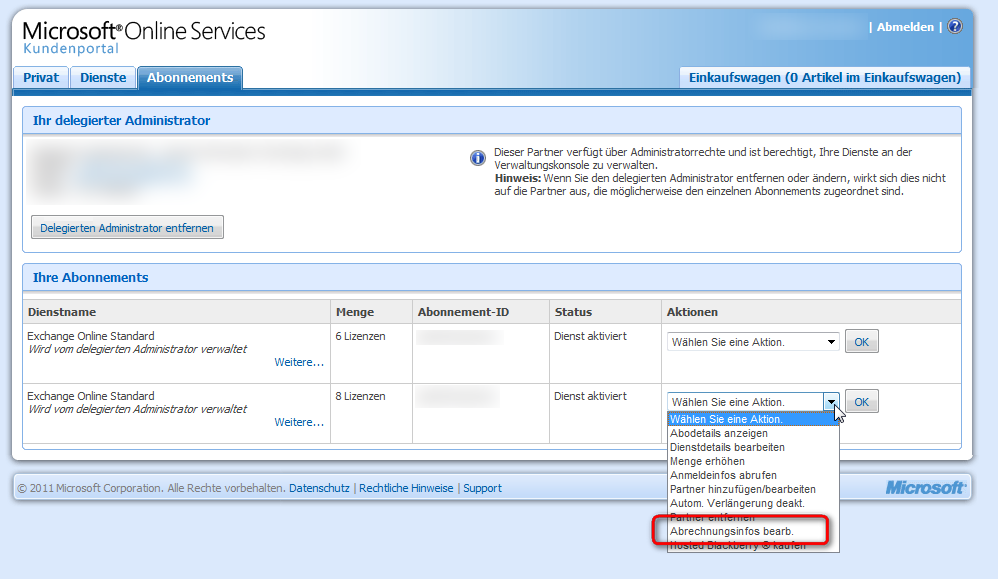In Ihrem Microsoft Online Services Kundenportal, auf das Sie mit Ihrer Windows Live ID Zugriff haben, können Sie Rechnungen abrufen, die Menge Ihres Abo’s anpassen, neue Produkte dazu kaufen, etc.