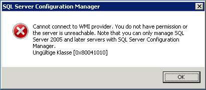 Das ist in meinem Fall zwar nicht passiert, aber das Problem dürfte dasselbe sein: Die Verbindung des SQL Server Configuration Managers zu WMI klappt nicht.