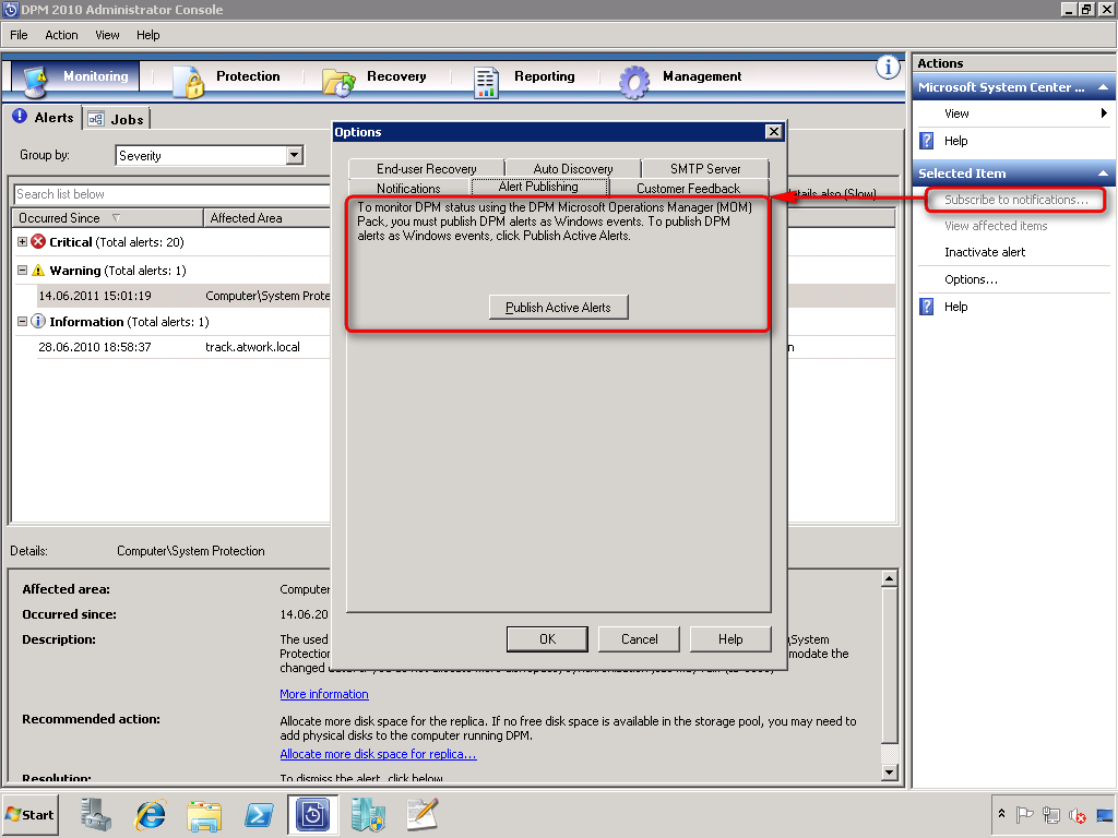 Auf der DPM Seite müssen die DPM-Warnungen als Windows Events geliefert werden. Das funktioniert in der DPM-Console durch Aktivieren von “Publish Active Alerts” in Monitoring / Subscribe to notifications…: