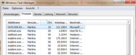Nehmen wir einmal an, der Prozess, der eine zu hohe CPU Last hat, ist Outlook. Das ist natürlich etwas ärgerlich, da Outlook im Normalfall jenes Programm ist, welches den ganzen Tag geöffnet ist. Auch wenn man – gemäß der GTD-Theorie (Getting Things Done) – nur 2mal täglich E-Mails liest und beantwortet, so ist Outlook doch auch Terminkalender, hilft Aufgaben zu verwalten, etc.