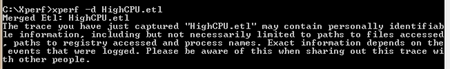 Nach einiger Zeit können Sie das Trace beenden und die Ergebnisse ausgeben: xperf –d HighCPU.etl