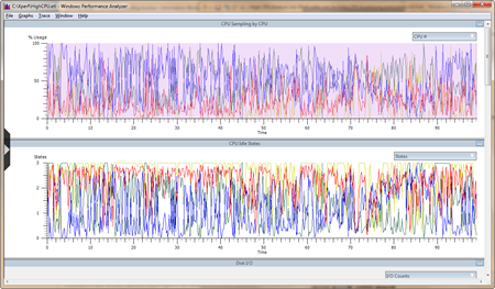 Daraufhin öffnet sich der Windows Performance Analyzer, der Ihnen die einzelnen CPU’s, I/O, ausliest.: