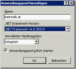 Achtung: Der zugehörige ApplicationPool wird damit NICHT automatisch angelegt! Daher muss der AppPool noch selbst erstellt werden: