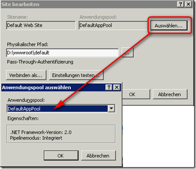 Und am Ende noch die Zuweisung des Webs zum richtigen AppPool kontrollieren (sinngemäß wie unten) und danach das Web neu starten.