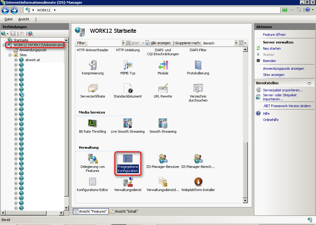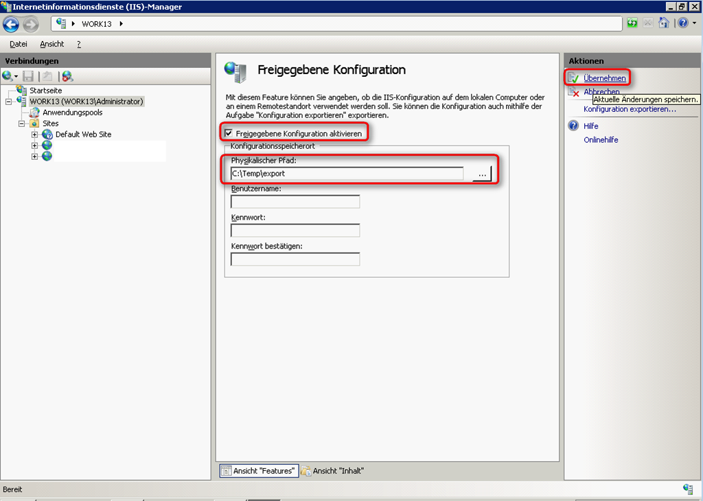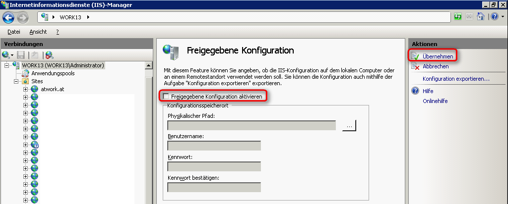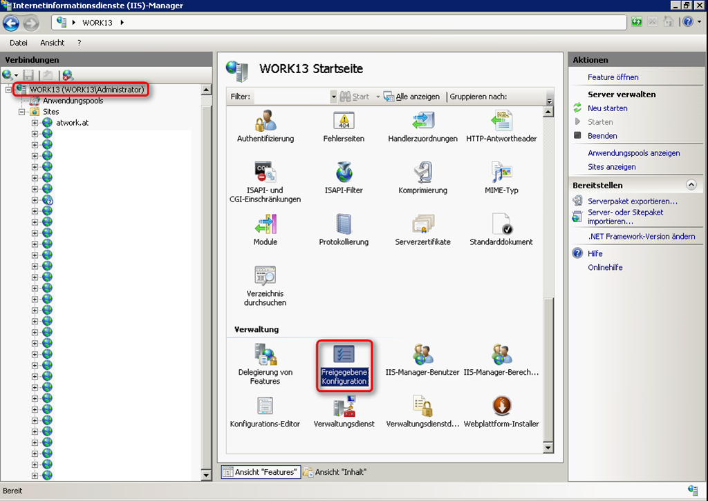 Auf dem Zielrechner öffnen Sie genauso IIS Manager und wählen den Serverknoten (hier: work13) aus und klicken auf “Freigegebene Konfiguration” (wie oben).
