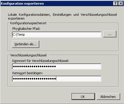 Wählen Sie in der folgenden Dialogbox den Pfad für die Export-Files aus und vergeben Sie ein sicheres Kennwort. Hinweis: Das Kennwort muss tatsächlich “sicher” sein, d.h. Sie können nur fortsetzen, wenn es lang genug ist, Groß- und Kleinschreibung und Zahlen enthält. Nachdem ich mehrmals vergeblich Kennworte eingetragen habe hier mein Tipp: Ein Kennwort wie “MeinGeheimesKennwort%2011” entspricht den Richtlinien – huch jetzt habe ich mein Kennwort verraten – aber so klappts.