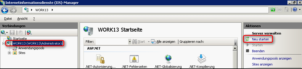 Danach beenden Sie den IIS Manager und starten diesen neu und restarten Sie den Webserver (rechts in der TaskPane):