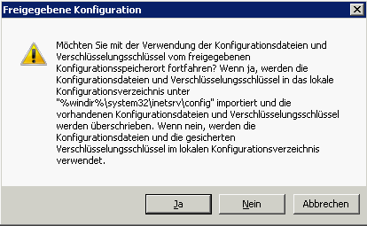 Wählen Sie “Ja”. Dabei werden diese Konfigurationsdateien nach C:\Windows\System32\inetsrv\config kopiert – damit wird diese Konfiguration wirksam. Jetzt noch einmal bestätigen: