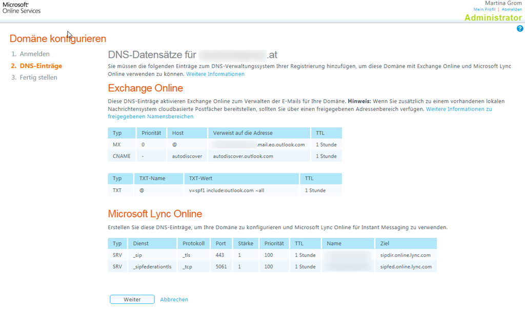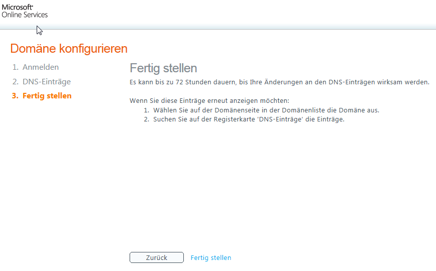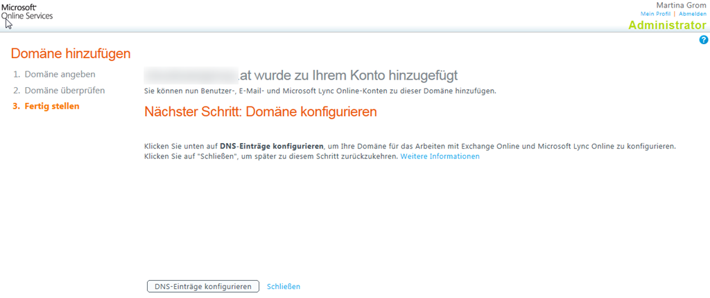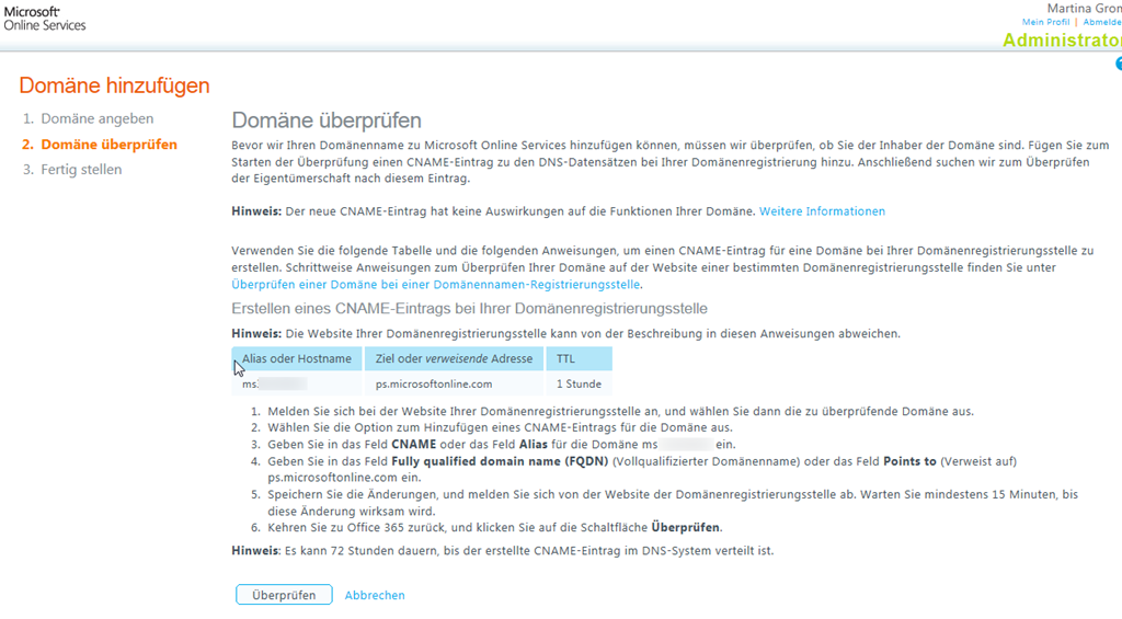 Nun wird die Domain überprüft. Nach einer Bestätigung erhalten Sie nun die Informationen, die Sie zur Validierung Ihres Domainnamens in der DNS-Zone der eben eingetragenen Domain hinterlegen müssen. Dieser Schritt ist nötig, damit Microsoft sicher stellen kann, dass Sie auch tatsächlich berechtigt sind, diese Domain einzutragen. Das ist bei Office 365 nun auch nicht unbedingt neu – genau der gleiche Vorgang war schon bei BPOS notwendig.