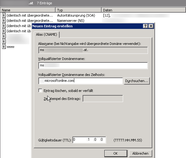Abhängig davon, ob Sie Zugriff auf ein DNS-Panels Ihres Providers haben, oder selbst die Zonen verwalten, können Sie nun die erforderlichen CNAME Einträge gleich selbst vornehmen. In meinem Beispiel verwalte ich die Domain selbst und trage deshalb die CNAME Info direkt im dafür zuständigen DNS Server ein.