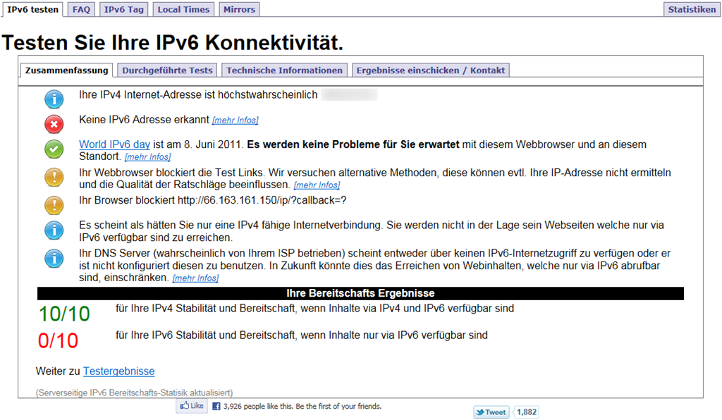 Achja, hier kann man seine eigene, aktuelle (externe) IPv6 Connectivity testen: