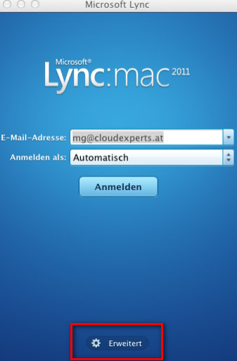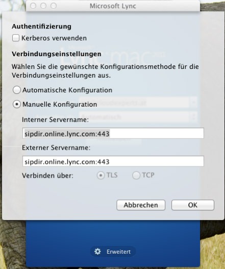 Hier nun bitte vor dem Anmelden auf die Schaltfläche Erweitert klicken und die manuelle Konfiguration durchführen. Hier bitte in das Feld Interner Servername und Externer Servername jeweils sipdir.online.lync.com:443
