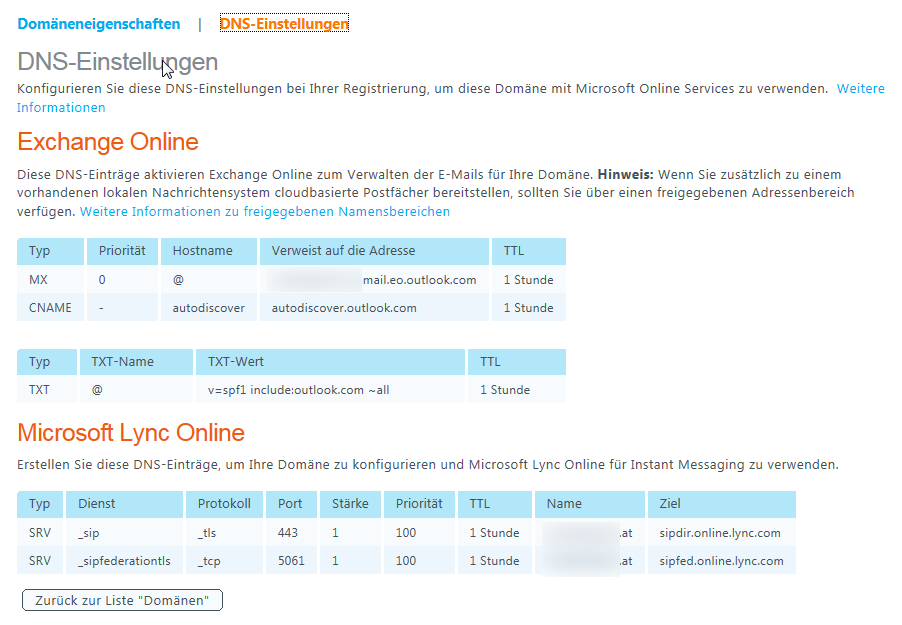 Bevor Sie Lync verwenden können, sollten Sie darauf achten, dass auch alle DNS Einträge vorhanden sind. Diese finden Sie unter Domänen / Domäneneigenschaften / DNS-Einstellungen.