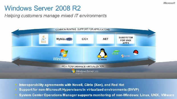 Microsoft hat mit Web Matrix und dem Web Platform Installer die Möglichkeit geschaffen, Open Source Projecte für das Web bereits einige Open Source Programme dabei. Office 2010 ermöglicht eine gute Interoperabilität mit offenen API’s und offenen Protokollen – ein Beispiel ist die Möglichkeit Active Sync mit nahezu jedem modernen Device (Smartphone) zu verwenden. Ebenso verhält es sich in der Interoperabilität mit anderen Betriebssystemen und deren Überwachung: System Center Operations Manager unterstützt auch das Monitoring von Nicht-Microsoft Betriebssystemen (Linux, Unix, VMWare).