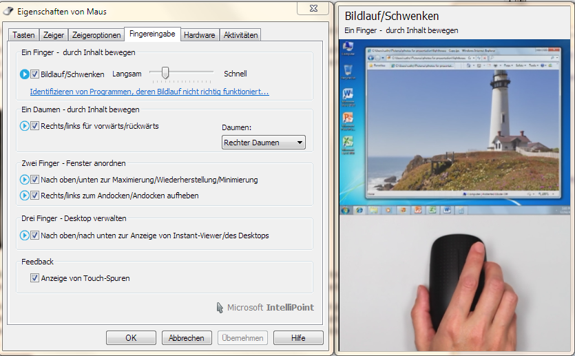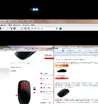 Touch me! Das Mauserl lässt sich aber mit ein, zwei und drei Fingern bedienen, auch an den Daumen wurde gedacht. Hier sieht man mit kleinen hellblauen Lichtpunkten direkt am Schirm, welche Geste gerade durchgeführt wird. Die Gesten dienen hauptsächlich der schnelleren Bewegung durch einzelne Fenster. Mit jeweils 2 Fingern nach links und rechts dockt man die Fenster am jeweiligen Bildschirmrand an, zwei Finger nach unten minimiert alle Fenster.